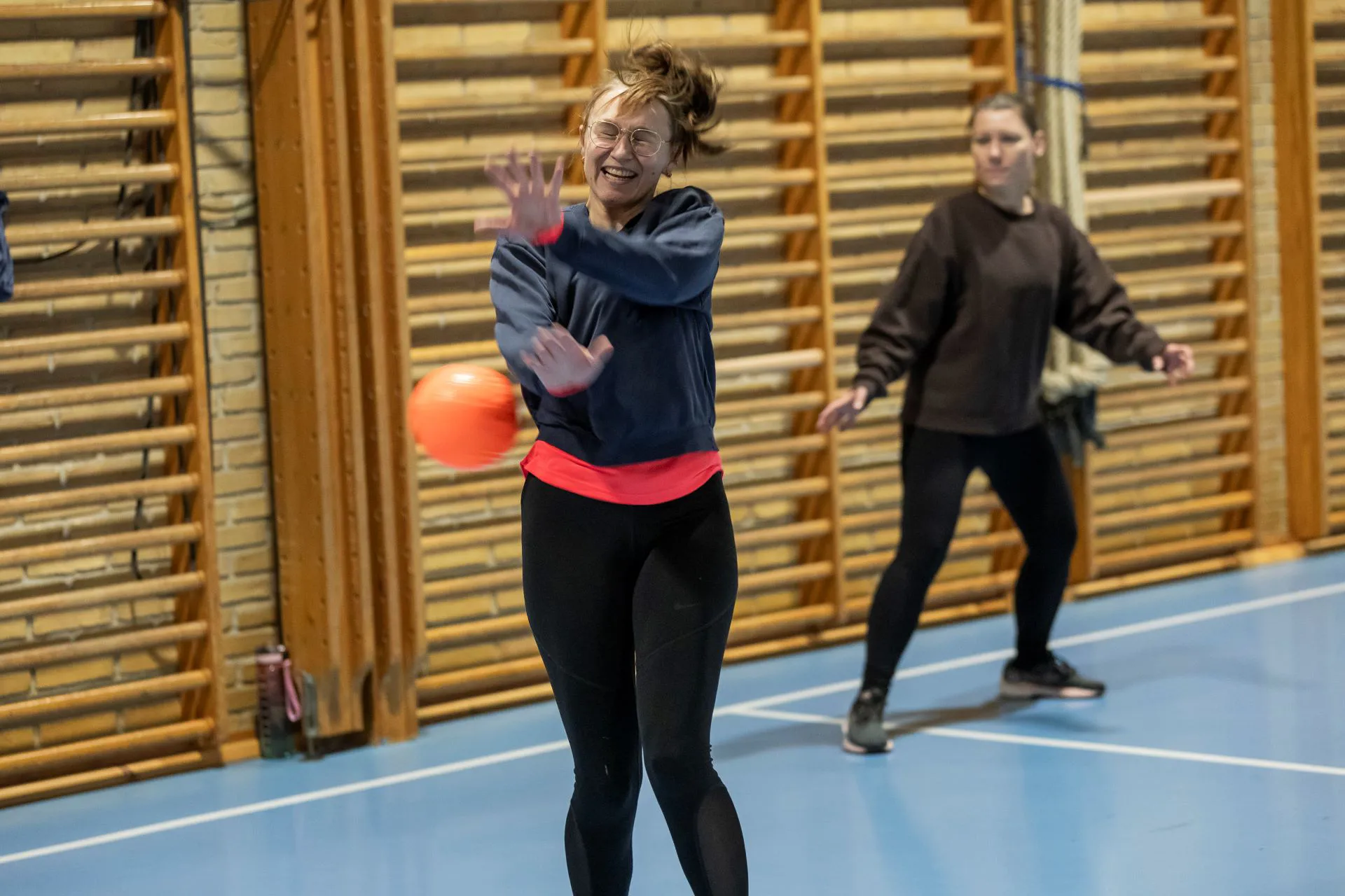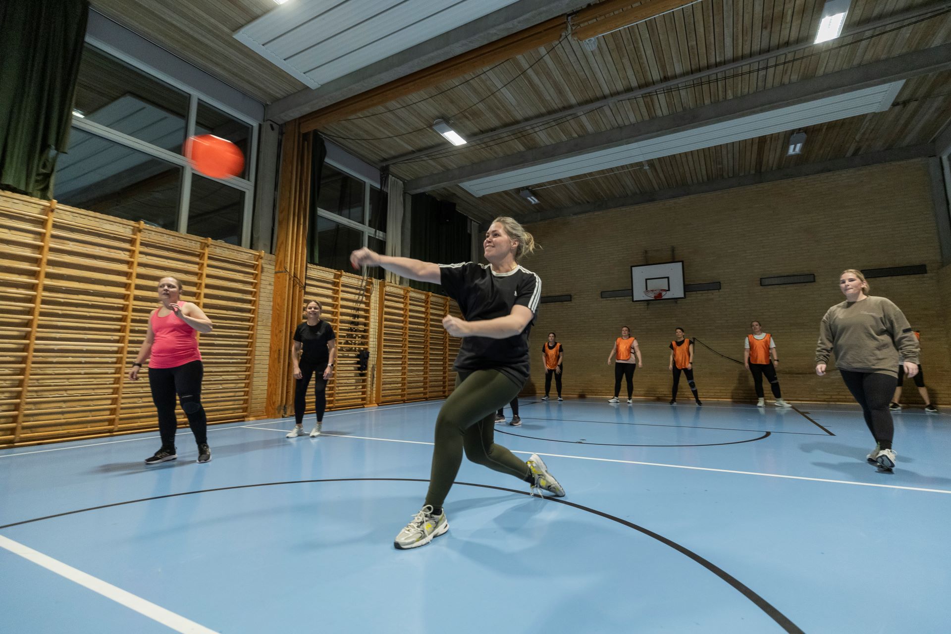 Når ungerne er lagt i seng, mødes en flok kvinder i gymnastiksalen i Tranbjerg, og så får legebarnet lov til at folde sig ud med høvdingebold.